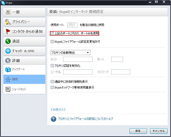Skype設定を見たところ確かにポート80を使用するという設定がされていました。